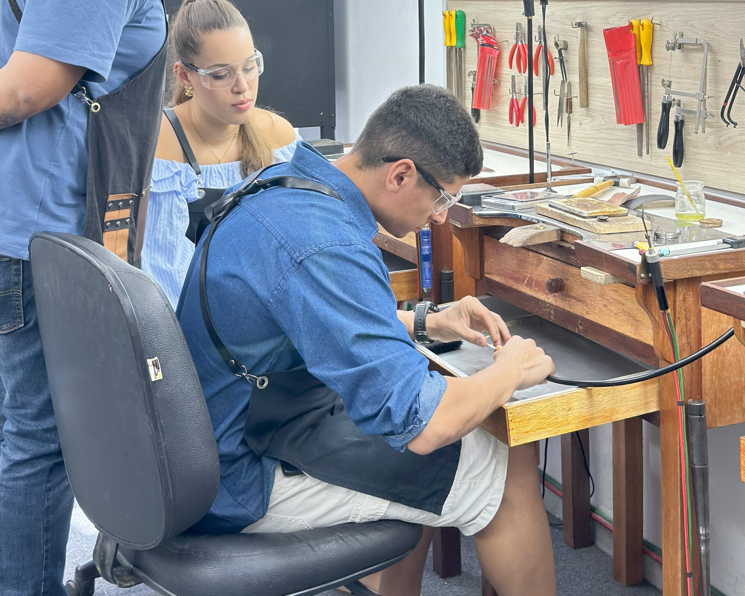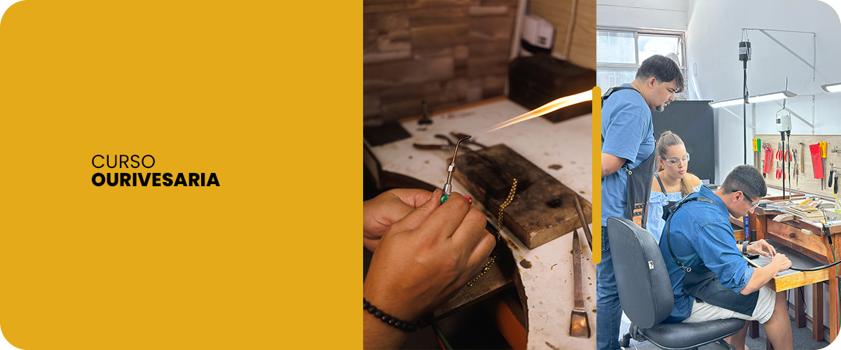 Nosso curso é presencial, 100% prático e focado na experiência real na oficina. Você vai criar suas próprias peças, usar as ferramentas do ourives profissional e aprender fazendo.